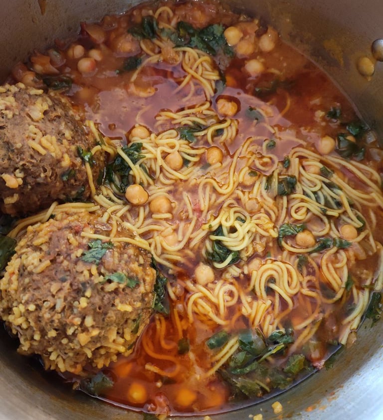 We begin with a comforting barley and chicken soup, followed by a rich lamb and eggplant stew, served with fragrant saffron rice and a fresh side salad.